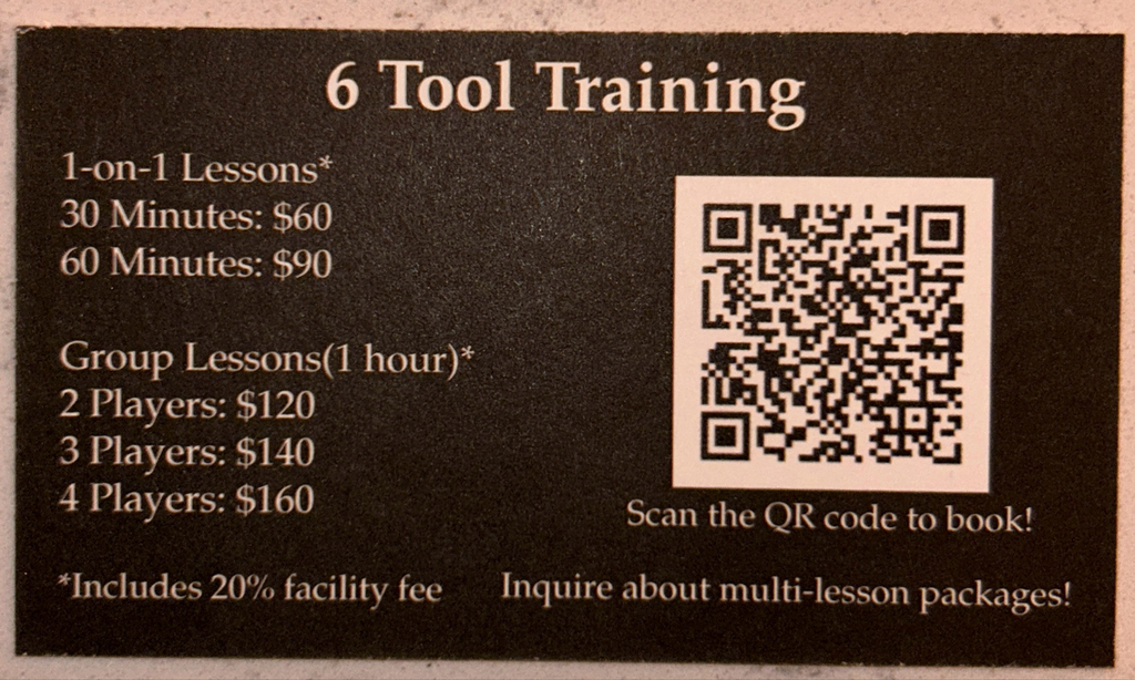 A typical session works specifically on 1 or 2 of the following tools(Hitting for Contact/Power, Defense(Infield, Outfield, Catching), Speed(Baserunning, Footwork), Throwing(Mechanics/Arm Care for Power/Accuracy). Along with these tools, there will also be a heavy emphasis on the 6th tool(Mindset).