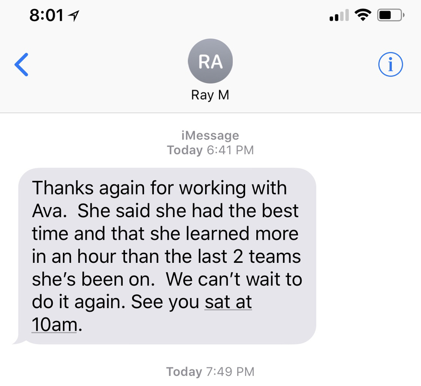 Coach Natalia worked with our 7 year old and she is excellent with kids. She keeps it fun and engaging. She did a great job encouraging him throughout the session. In the words of our son, "I really like how she did the drills and she was really good."